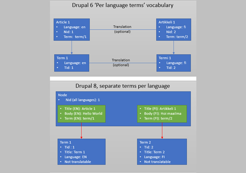 Localized term concept: In this concept, for Drupal 6, there are two node entities for English and Finnish language and associated with translation of each other. One taxonomy term entity for both the languages. The term title and description can be translated using string translation module. For Drupal 9, (as mentioned above) the node translations are migrated to Drupal 9 and then you have only one node for both languages. You have one taxonomy term entity likewise Drupal 6. In Drupal 9 or higher version, both language terms point to the same term.