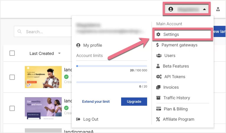 Log in to the Landingi platform, click on your profile at the top bar and then go to the Settings tab.