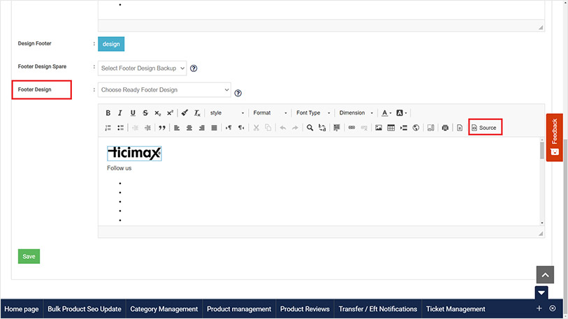 Now scroll down to the Footer Design and click on the Source tab.
