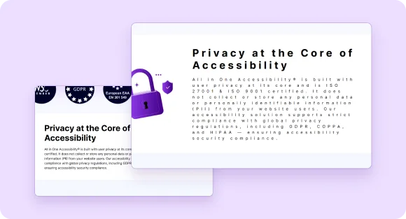 We are an ISO 9001:2015, ISO 27001:2022, GDPR, COPPA, HIPAA, SOC2 TYPE2 and CCPA compliant company. As a member of W3C and the International Association of Accessibility Professionals (IAAP), we are applying the best industry practices and standards for both - security of the website and privacy of users